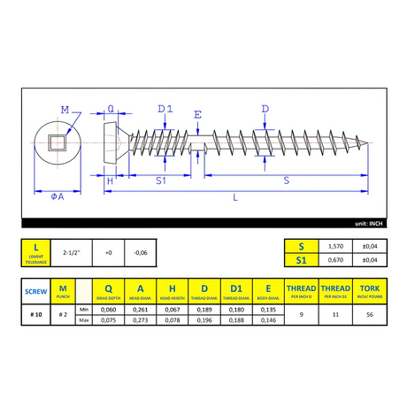 #10 x 2" Wood Screws Flat Head Square Drive Twinfast Thread Regular Point Zinc