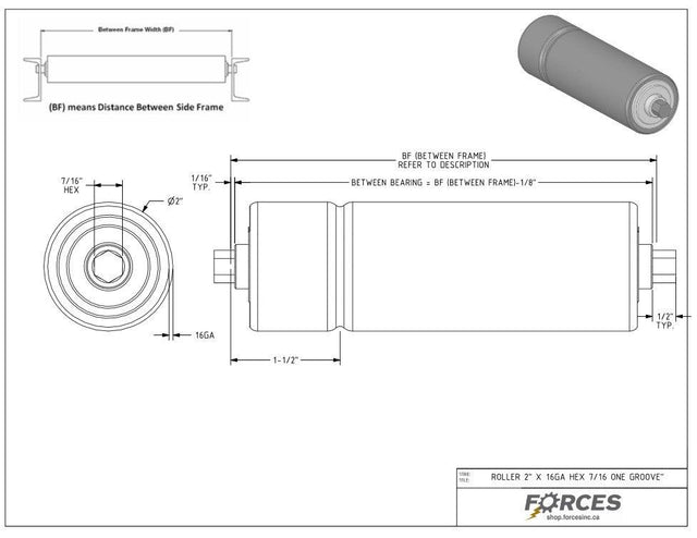 Forces Inc Conveyor Rollers 57-1/4" BF | 2" Dia. (1) Groove Hex Shaft 7/16" 16 Ga HRPO