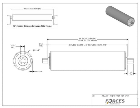 Conveyor Rollers 34" BF | 1.5" Dia. Hex Shaft 5/16" 11 Ga HRPO