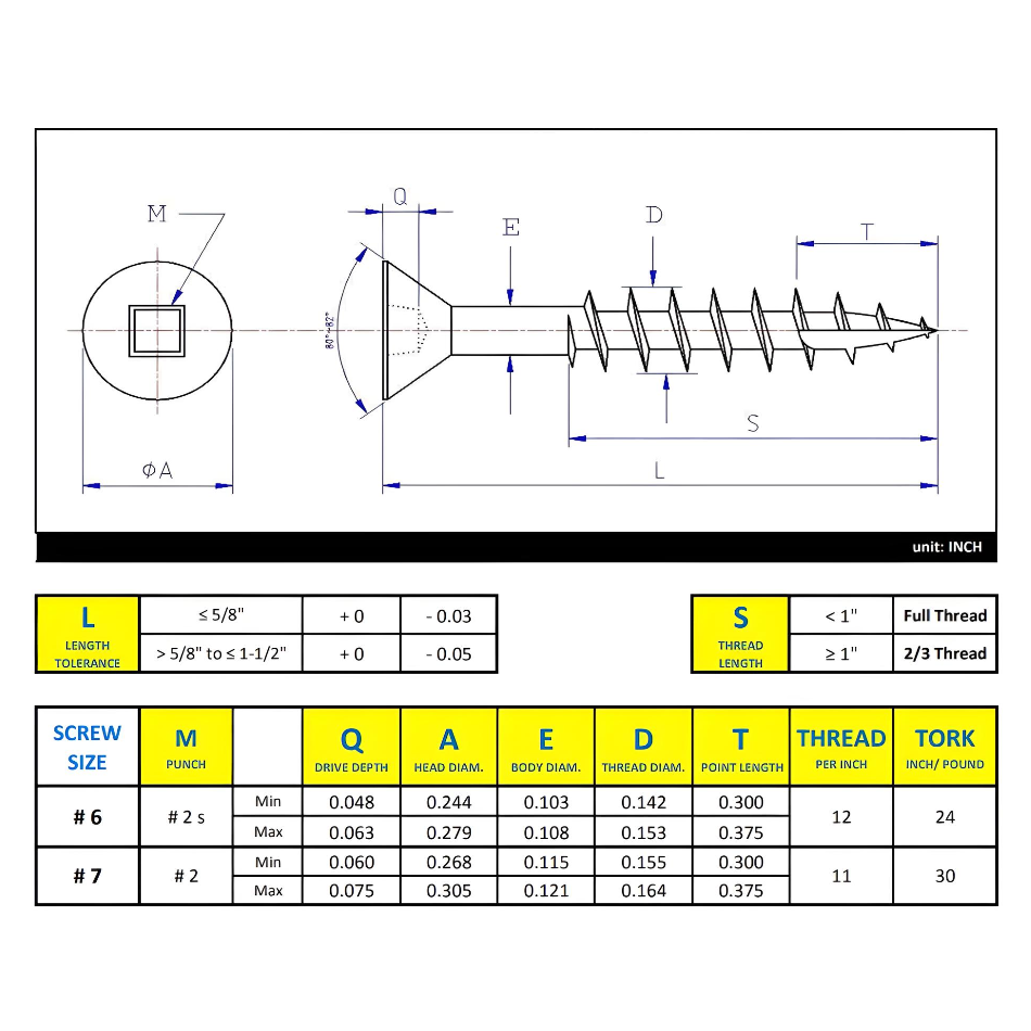 Product Details : #6 x 3/4" Wood Screws Flat Head Square Drive Coarse Thread Type 17 Point Zinc