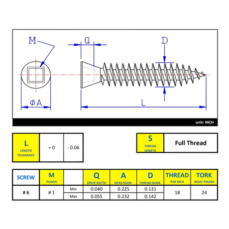 #6 x 1/2" Metal Screw Flat Head Square Drive Type A Point - Stainless Steel 18-8