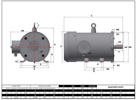 Max Motion MQSP-2002TL | NEMA Motor 20HP, 3600RPM, 208-230/460V, Frame 256TC, TEFC, Rigid Base
