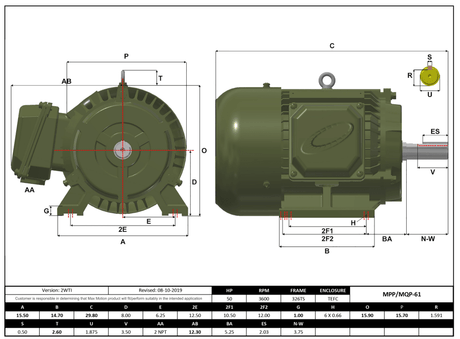 Max Motion MQP-61 | T-Frame Motor 50HP, 3600RPM, 208-230/460V, Frame 324TS, TEFC, Cast Iron