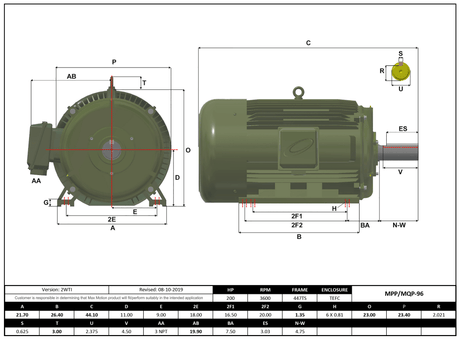 Max Motion MQP-96 | T-Frame Motor 200HP, 3600RPM, 460V, Frame 447TS, TEFC, Cast Iron