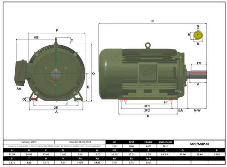 Max Motion MQP-88 | T-Frame Motor 150HP, 1200RPM, 460V, Frame 447T, TEFC, Cast Iron